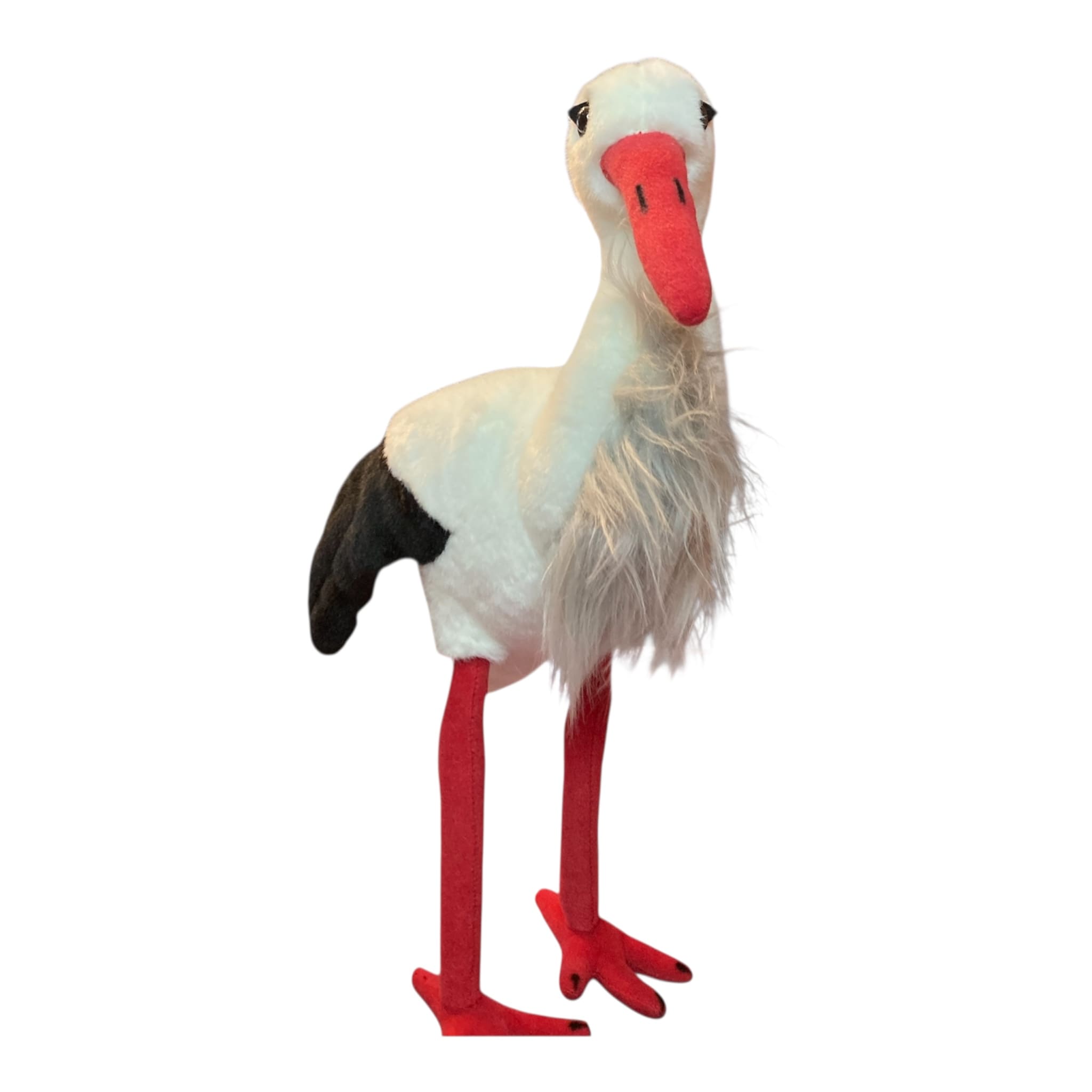 Réalisme : Une cigogne en peluche réaliste avec un long bec noir, parfaite pour l’apprentissage des grands oiseaux.